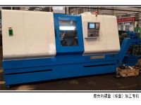 本機床用于汽車差速器殼體內(nèi)腔平面及球面的加工。機床為臥式雙面布置,左端為DSS精鏜頭和液壓滑臺組成,右端為DSS精鏜頭(從動軸,無動力)和液壓及液壓滑臺組成。中間為夾具,夾具安裝在專用數(shù)控移動工作臺上,用于锪面進(jìn)給。后方為雙位送刀機械手,上件后送刀機械手送粗加工刀進(jìn)去,動力頭頂緊刀具機械手退回,數(shù)控工作臺左右工進(jìn),完成粗锪面工序。刀具回位后,機械手將粗锪刀取走,另一機械手送精锪刀進(jìn)入工件,重復(fù)上次循環(huán),完成精加工。一次裝夾一個工件。可通過更換、調(diào)整定位夾緊元件,實現(xiàn)多品種的互換加工。